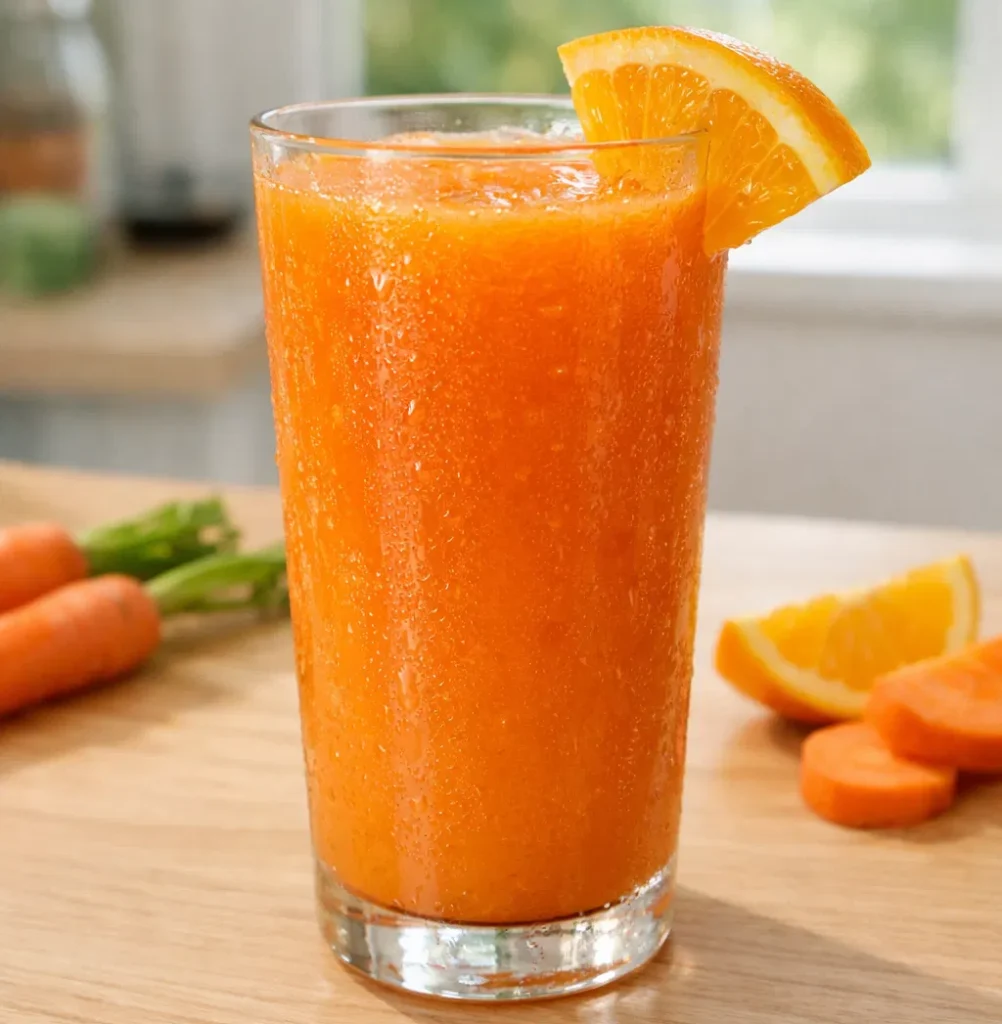 This carrot juice is approximately 120 calories per serving, providing a good source of vitamin A and hydration, thanks to its high water content.