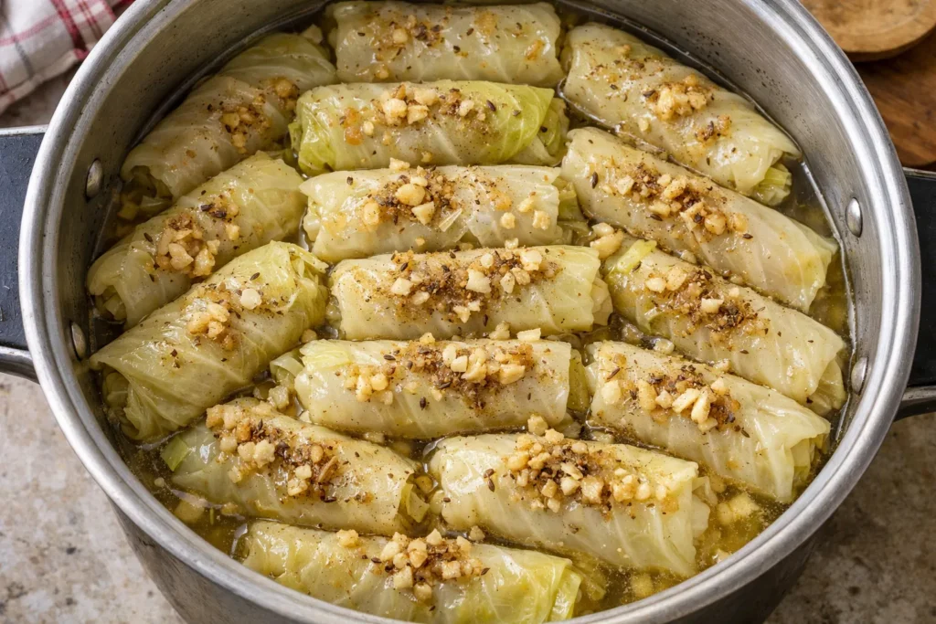 - In a pot, coat the bottom with leftover cabbage leaves, then layer the stuffed rolls in a single layer.