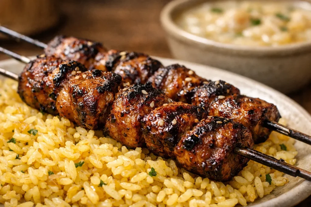 This dish shows up a lot in my kitchen on weekends when we’re after something filling for lunch. It’s basically boiled meat that’s marinated and grilled over charcoal, served with rice cooked yellow from turmeric and curry, plus an onion soup made from the broth you get from boiling the meat. I usually boil a big piece first thing in the morning so the broth is ready for both the rice and soup. No need for fancy gear beyond skewers and a grill—I’ve done the meat in the oven broiler when it’s raining, turns out fine but misses that smoky edge. Last time I rushed the rice and skipped soaking it properly, ended up a touch gummy, so now I give it 20-30 minutes in water before draining. Keeps everything straightforward, uses up the broth without waste, and feeds my family without much fuss. The soup’s creamy from blending the caramelized onions right in, adds a nice contrast to the chewy grilled bits.